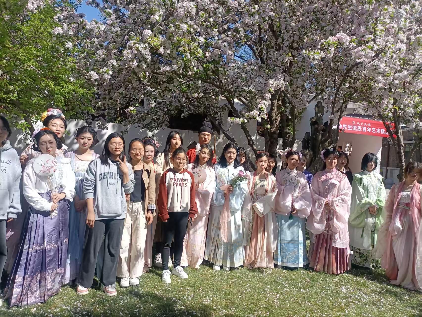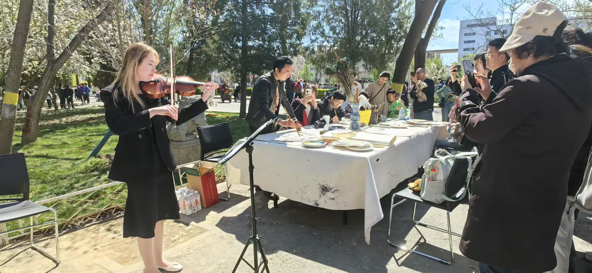 又迎天大海棠季,湖畔心清绘花雪。海棠树下,王学仲艺术研究所副教授刘珺与师生观众一起,开展以海棠为主题的绘画写生活动。天津大学俄罗斯籍研究生奥苏演奏的《茉莉花》等优美旋律邂逅《北洋春意——海棠图》中国画现场创作,激荡出更多心灵触动和文化共鸣。活动现场,刘珺还指导学生进行了汉服着装人像写生、海棠徽章制作,为天大海棠季增添更多人文艺术色彩。