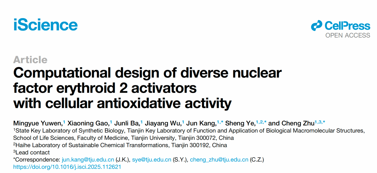 近日,天津大学医学部生命科学学院祝诚、叶升研究团队在Cell旗下的iScience期刊发表了题为“Computational Design of Diverse Nuclear Factor Erythroid 2 Activators with Cellular Antioxidative Activity”的研究论文,基于深度学习蛋白质设计方法RFdiffusion、ProteinMPNN和深度学习蛋白质结构预测模型AlphaFold2的综合运用,成功设计了一系列激活NRF2转录因子和下游抗氧化基因表达的miniBinder,并通过实验证实了所设计蛋白的胞内活性。