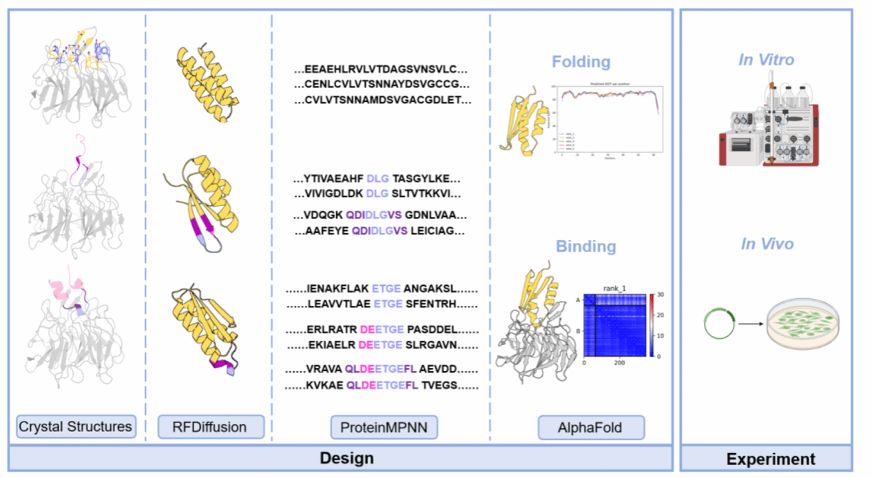 (4) 综合RFdiffusion、ProteinMPNN、AlphaFold2三种人工智能模型的设计流程显著提高了蛋白质从头设计的成功率,本研究测试的13种设计蛋白有11种可溶表达,成功率>90%。