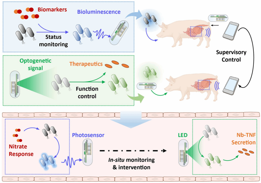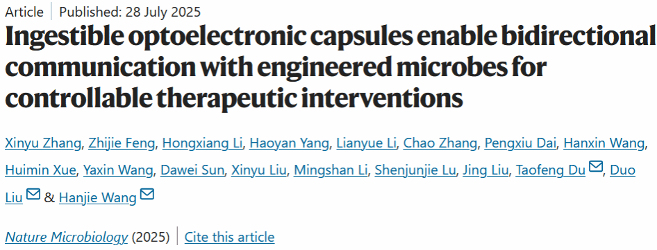 2025年7月28日,发表在《Nature Microbiology》上的研究,初步建立了上述“指挥艇模式”的概念模型,构建了一种“光电子胶囊-微生物双向交流语言”,实现了对肠道微生物原位监测与即时控制。
