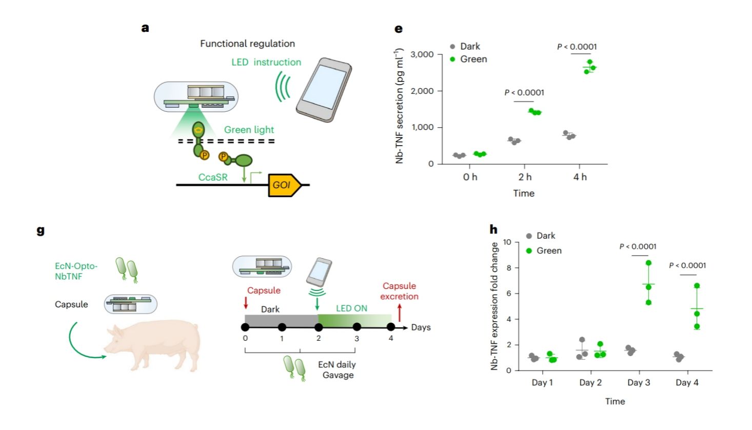 自然界中的蓝细菌等微生物可以依靠各种各样的光感受蛋白感知环境光的变化,调控自身的生命活动。研究人员为微生物构建了一套基于绿光感受蛋白的基因调控方案,使微生物可以灵敏地接受人为施加的绿色光的“指令”,表达特定的基因。研究人员证明了光电子胶囊可通过LED发光,可控地激活微生物,使微生物表达分泌蛋白质。微生物被激活表达基因的强度,与光照指令的持续时间具有正相关性,微生物在7厘米的光照半径范围内均可感受光学指令。研究人员将光学指令用于控制微生物表达分泌抗TNF纳米抗体(一种具有抗炎功能的蛋白质),证明了微生物可以在体外、体内正确地接收光学指令,按照光学指令生产纳米抗体。以上过程建立了由智能手机APP控制的电子胶囊到工程菌的信息传递。