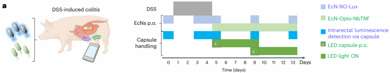 至此,研究人员建立起了电子胶囊与微生物之间双向的“光学语言”。借助电子胶囊“传译”的光学语言,人们能够读懂微生物对肠道环境的“感受”,并且能够给肠道中的微生物下达指令,让微生物按照人类的需求工作。接下来,为了在真实的“语境”中测验这一光学“语言”,研究人员构建了猪肠炎的疾病模型。