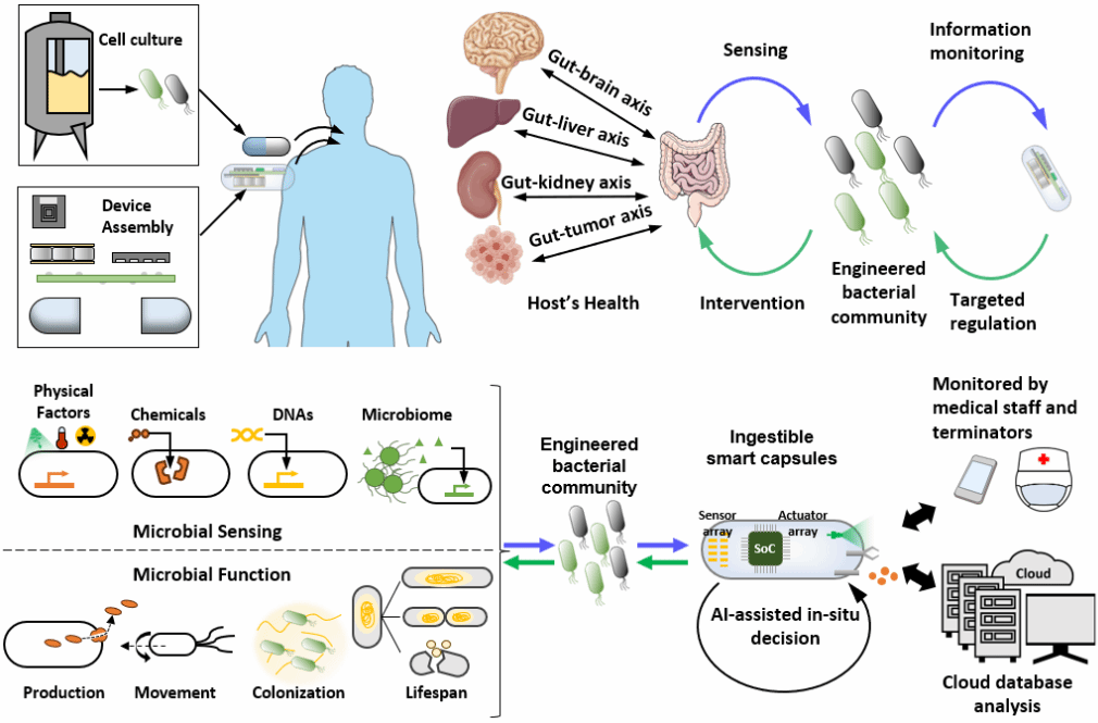 正如开头所描述的那样,微生物对于人体生命健康的方方面面都有着广泛的影响。借助这些原理的存在,通过对微生物的工程化设计,我们可以原位监测微生物在肠道中的各类“感受”(比如,让微生物响应放射物、化学小分子、核酸、病原微生物),或控制微生物在肠道中的各类行为(比如,生产、移动、定植、裂解)。此外,电子胶囊作为一个数字化的“指挥平台”,还可以接入AI辅助决策、云数据储存与分析等等诸多新技术,以帮助人们更全面地收集肠道微生物信息、更智能地调控微生物功能。