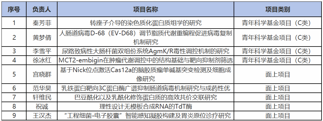 本次立项项目涵盖分子与结构生物学、微生物与免疫学、纳米生物医学等多个重点研究方向,呈现出“基础与应用并重、多学科交叉融合”的鲜明特色,充分体现学院坚实的科研基础和创新能力。学院青年教师表现突出,展现出学院青年人才队伍的活力与潜力。