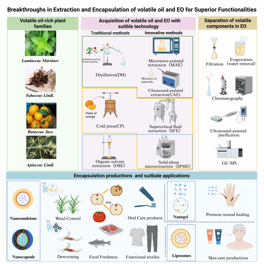 挥发油(在一些研究中也称为精油)富含萜类化合物、醇类和其他生物活性成分,在医药、食品、化妆品和农业领域得到广泛应用。芸香科、唇形科和十字花科是植物挥发油的常见来源,萜类化合物是其主要成分。然而,高挥发性、低水溶性和光热敏感性极大地限制了精油的实际应用。超临界流体萃取、无溶剂微波萃取结合超声预处理等提取分离技术可有效提高精油提取率。纳米胶囊和脂质体等方法能够有效提高挥发油稳定性和生物活性的包封形式。在应用层面,纳米乳液和皮克林乳液在护肤领域表现出色,纳米粒子和纳米胶囊在纺织品和食品调味中得到广泛应用,纳米水凝胶已成为药物输送的新载体,这些形式全方位突破了精油应用的局限性。本文通过构建“化学成分 - 提取技术 - 封装工艺 - 多元化应用”的多维研究框架,突破了传统单一研究的局限,为挥发油和精油领域的研究及工业发展提供了新的视角和理论支持。