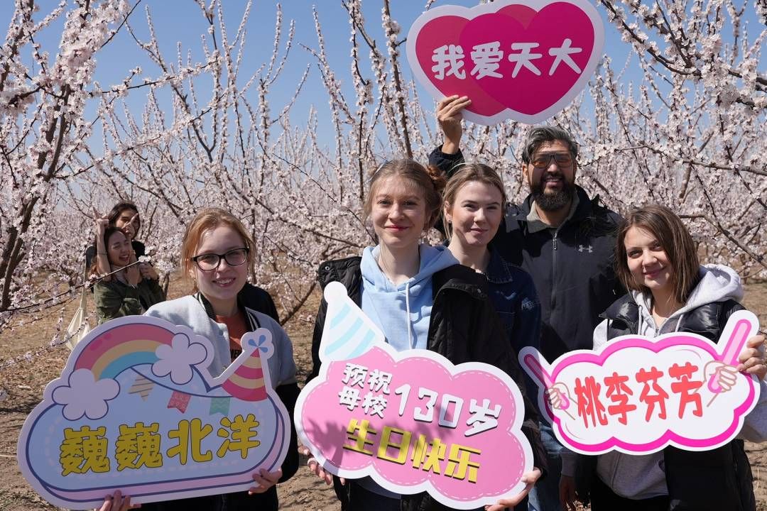 2024年3月30日,天津大学国际友谊林在天津市宁河区大贾庄村落成,来自五大洲36个不同国家的天津大学留学生在为期一天的“公益学农”活动中种下了130棵青青树苗,预祝母校130岁生日快乐。