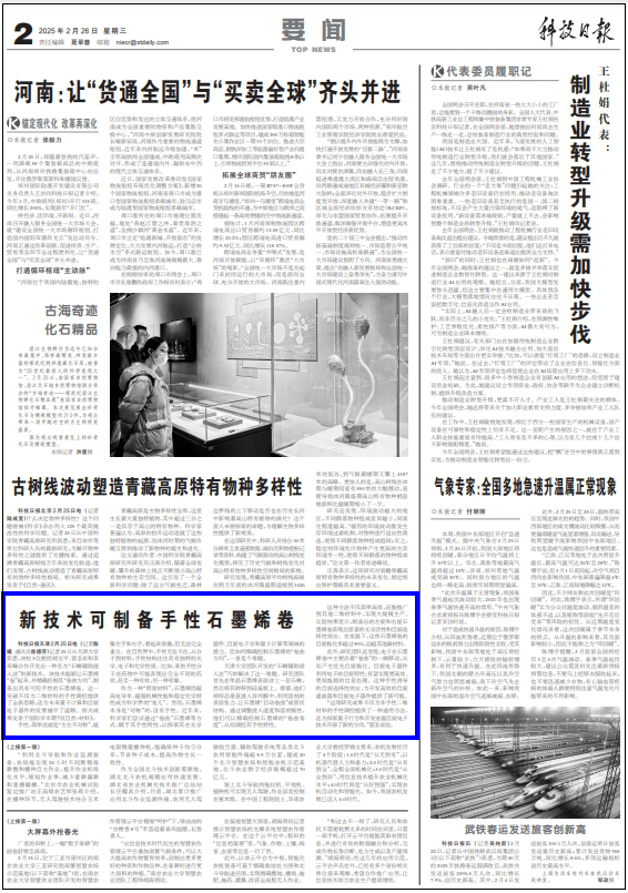 科技日报天津2月25日电 (记者陈曦 通讯员焦德芳)记者25日从天津大学获悉,该校3位教授胡文平、雷圣宾和李奇峰合作开发出一种名为“石蜡辅助浸入法”的新技术。该技术能够让石墨烯“卷”起来,并精确控制其“卷曲方向”,制备出具有可控手性的石墨烯卷。这一突破不仅为二维材料的手性调控提供了全新思路,还为未来量子计算和自旋电子器件的发展铺平了道路。相关成果发表于国际学术期刊《自然·材料》。