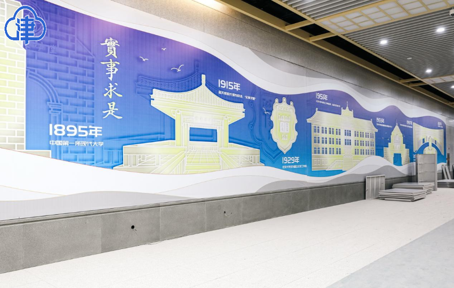 站厅两侧设置12米长的铝板蚀刻《南开百年风云》,以时间轴呈现创办私立南开大学、西南联大时期“刚毅坚卓”的办学历程、 “为中华之崛起而读书”的求学故事等标志性事件,通过金属蚀刻工艺与LED背光技术,实现历史场景的动态光影演绎。