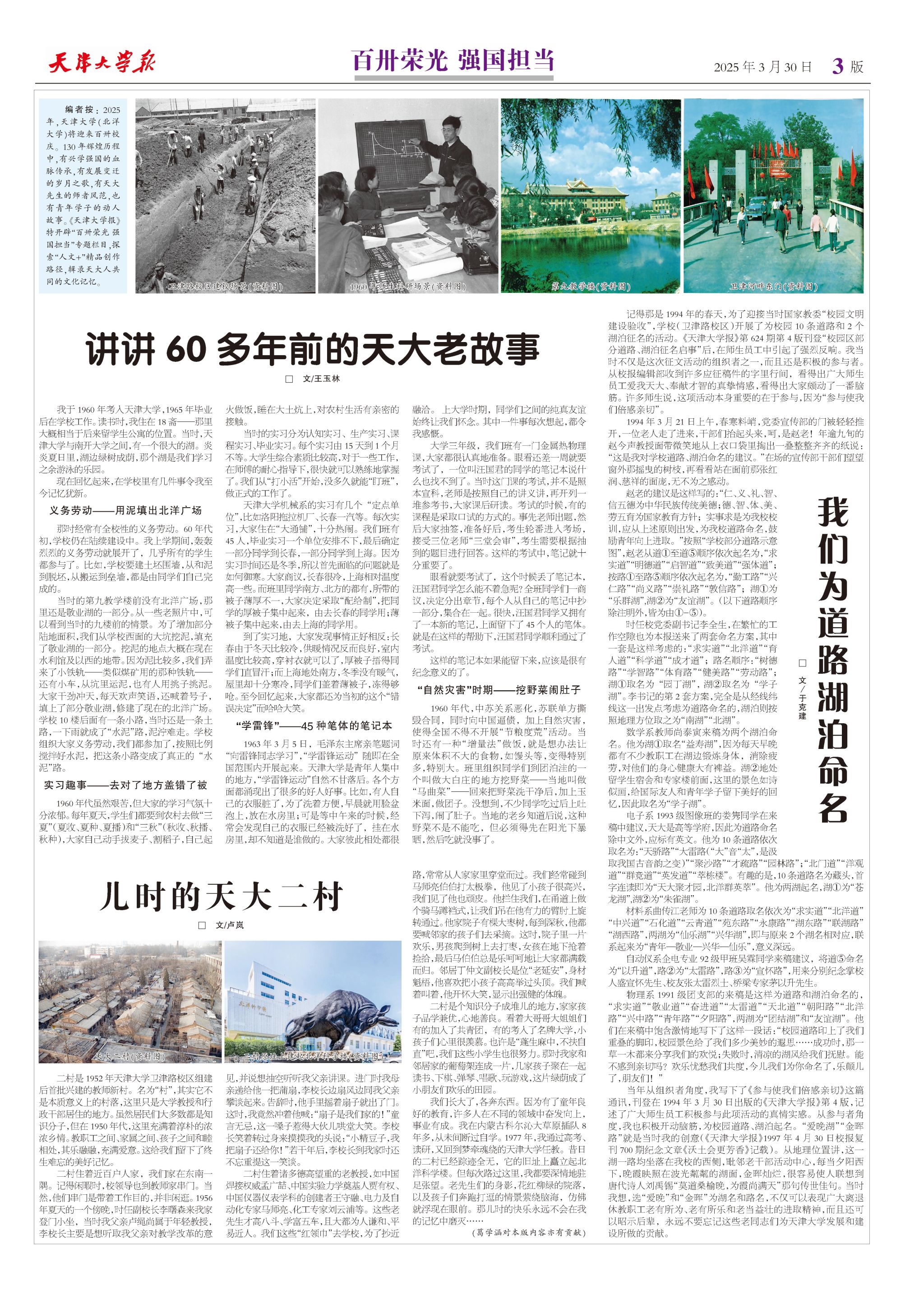 编者按: 2025年,天津大学(北洋大学)将迎来百卅校庆。130年辉煌历程中,有兴学强国的血脉传承,有发展变迁的岁月之歌,有天大先生的师者风范,也有青年学子的动人故事。《天津大学报》特开辟“百卅荣光 强国担当”专题栏目,探索“人文+”精品创作路径,辑录天大人共同的文化记忆。