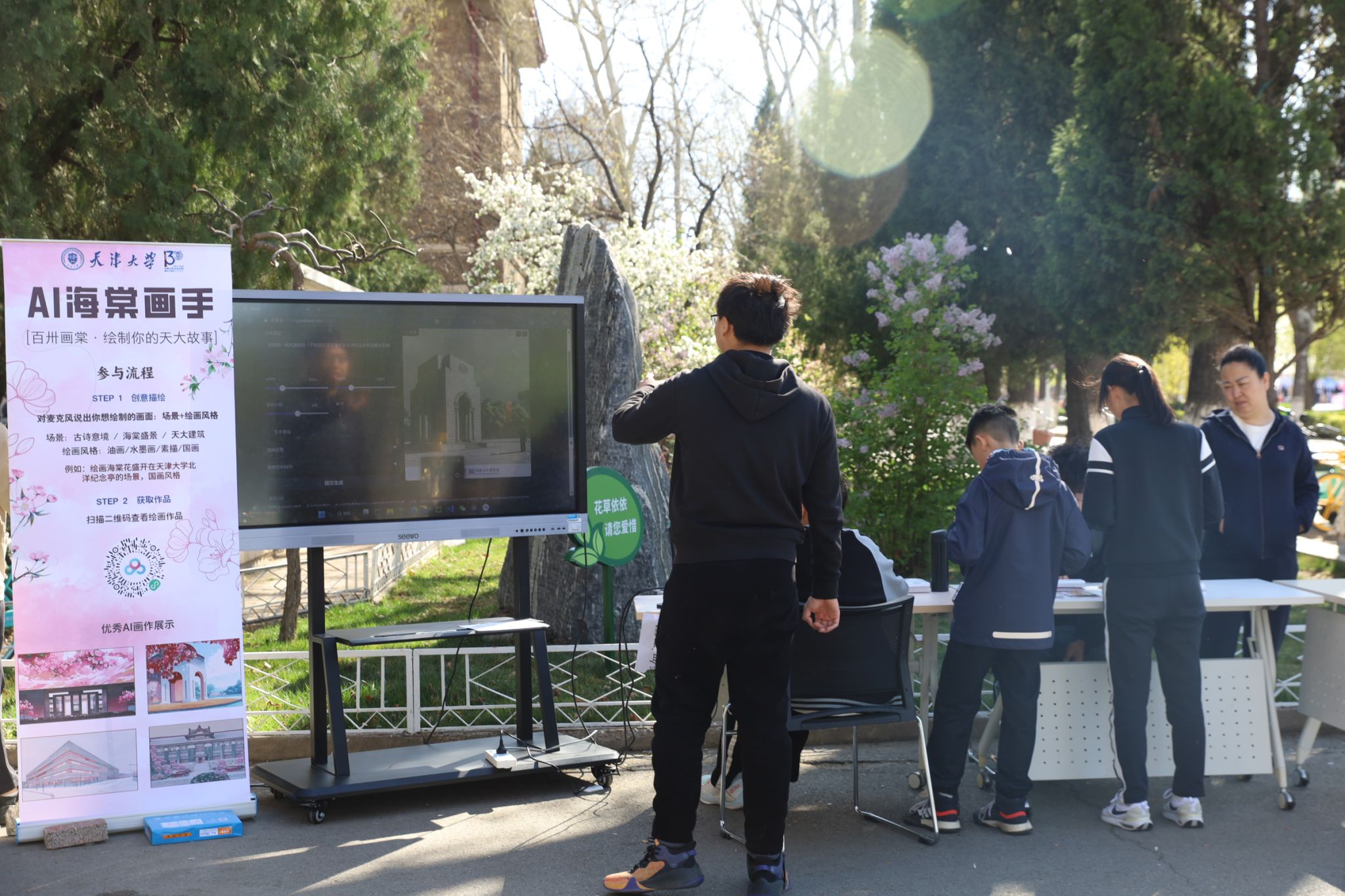 在春水图书馆前,“丹青与算法共舞”文化体验活动别开生面。建筑学院叶武老师现场指导手绘水彩,羊毫毛笔与宣纸间流淌出海棠春色。依托前沿人工智能技术,融入天大特色,AI绘画展位可实时生成游客心中的诗意画面——或是天大校园的巍峨地标,或是春日海棠的绚烂盛景。