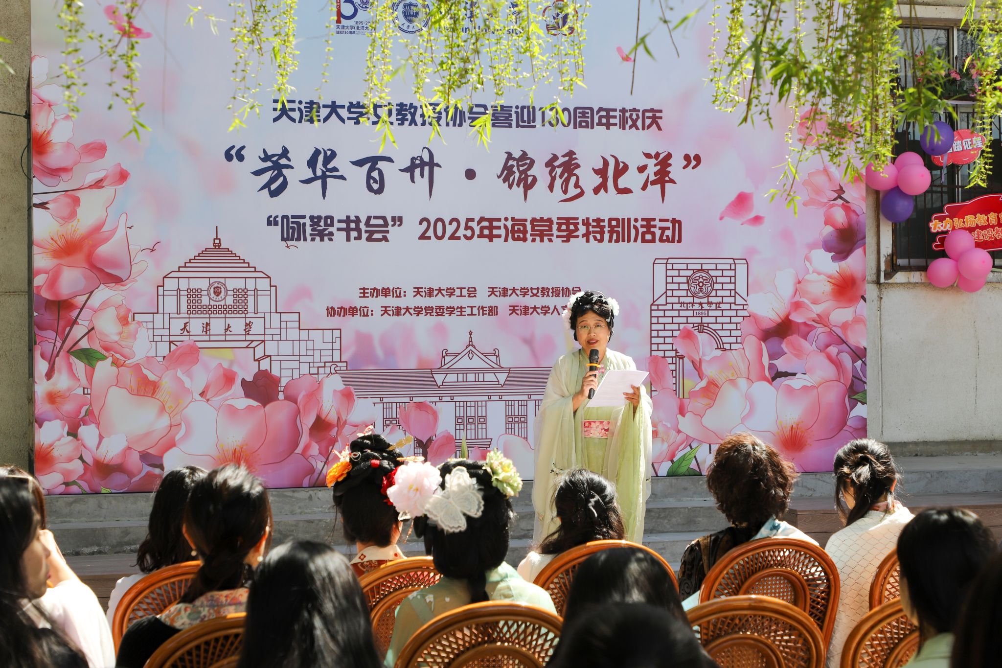 教职工活动中心外广场上,女教授协会“咏絮书会·海棠季”活动诗意盎然。50余位师生校友围绕海棠主题吟诵经典,从“四品九格”解读育人使命,以女性视角探讨家国担当。诗词与思想碰撞间,新时代“柔肩担重任”的精神力量浸润人心。
