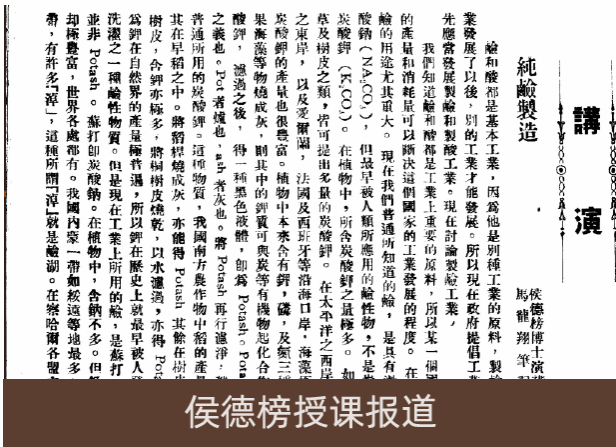 1925年,北洋大学开设工业化学讲堂,讲授工业化学等课程,开展实验、实习,正式宣告了天大化工学科的启航。这一时期,侯氏制碱法的创始人、中国重化学工业的开拓者侯德榜受聘担任特约讲师,讲授了《硫酸制造》《工业用水》《纯碱制造》等课程,为天大化工谱写了璀璨的一页。